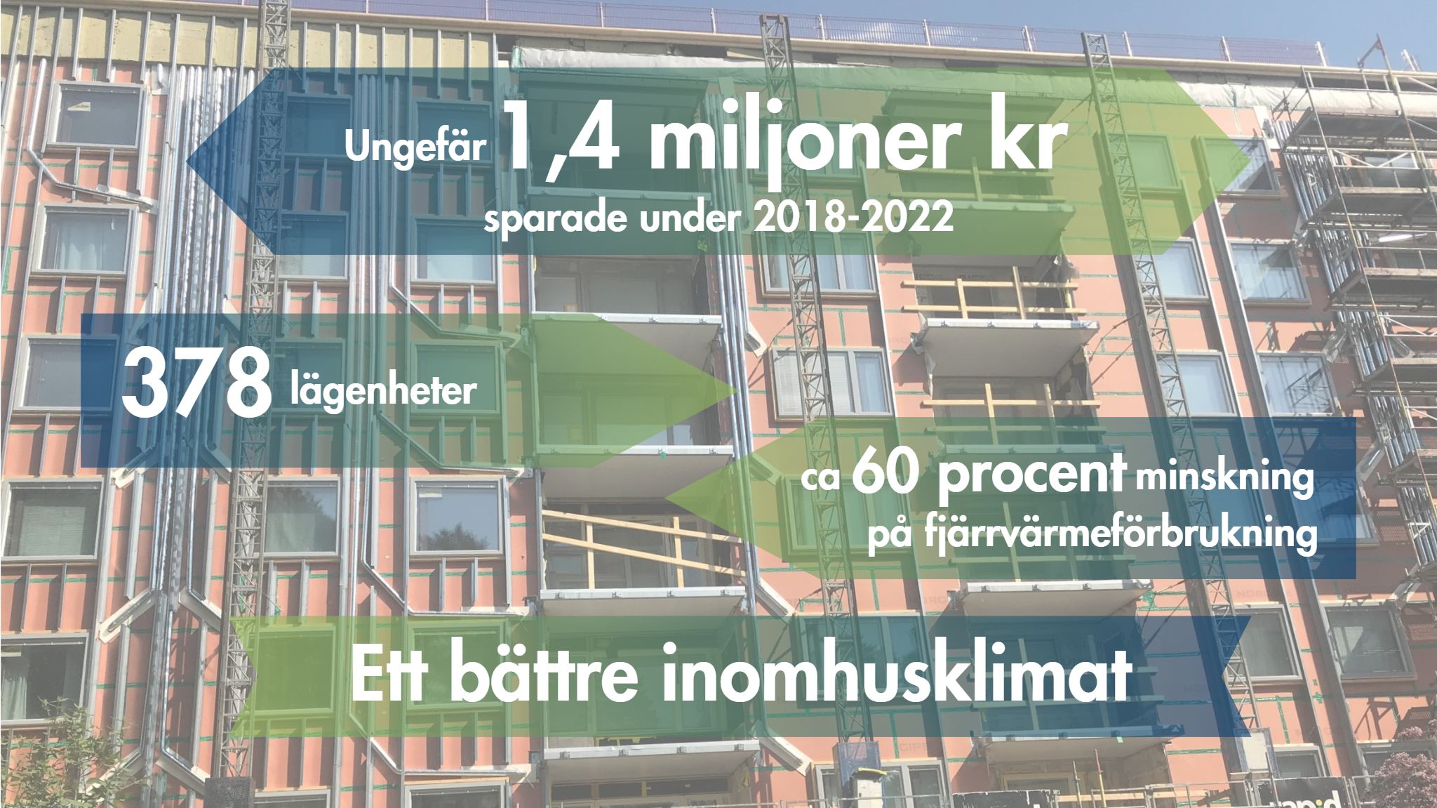 Med facit i hand har de energibesparande åtgärderna sammanlagt minskat föreningens fjärrvärmeförbrukning för bostadshusen med cirka 60 procent. I rena pengar handlar det om ungefär 1,4 miljoner sparade kronor, under åren 2018-2022.